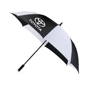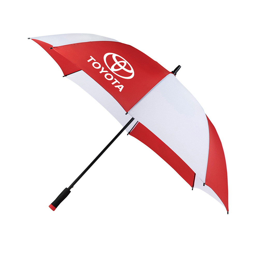 58” arc automatic opening. Powder coated metal shaft with fiberglass ribs. Comfortable 5” foam handle with color co-ordinating tip.Toyota logo imprinted on one panel.