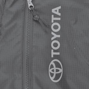 Toyota horizontal logo printed vertically down side of zipper as shown.