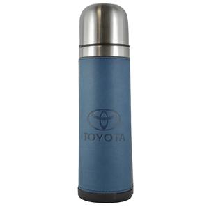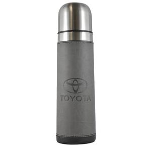 17oz full Stainless Steel construction. Vacuum seal insulation with leatherette sleeve. Push button pour spout. Cap functions as a lid and or cup. Includes the Toyota stacked logo debossed in leatherette sleeve.