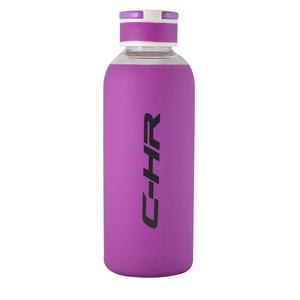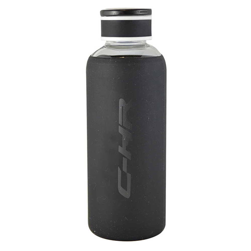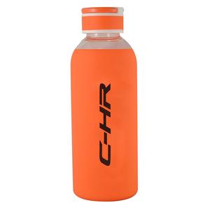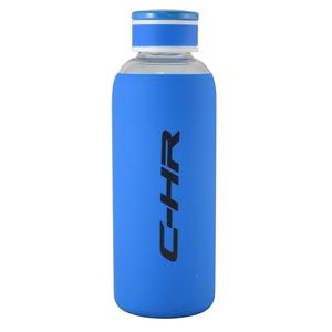 17.5oz Glass Water Bottle with a silicone removable wrap for cleaning. Screw on/off lid with a matching coloured carrying ring on handle.