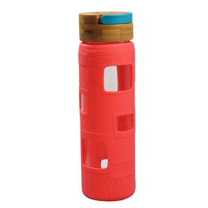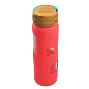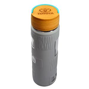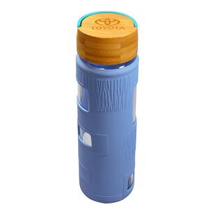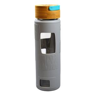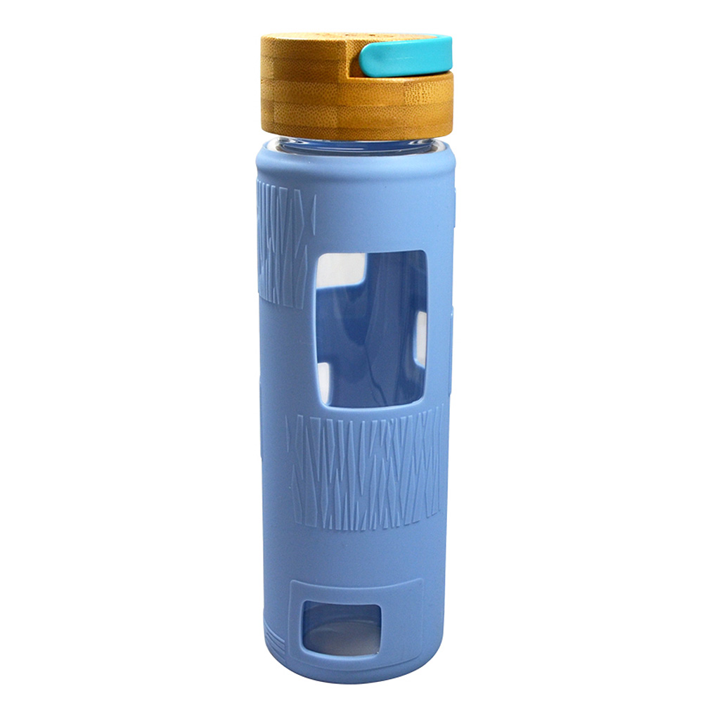 High quality glass water bottle with modular window designs and silicone sleeve with textured grip surface. Features a contoured, strong, durable natural bamboo screw top cap. Includes a sturdy flip carry handle with integrated tuck-away groove recess. 22oz capacity.